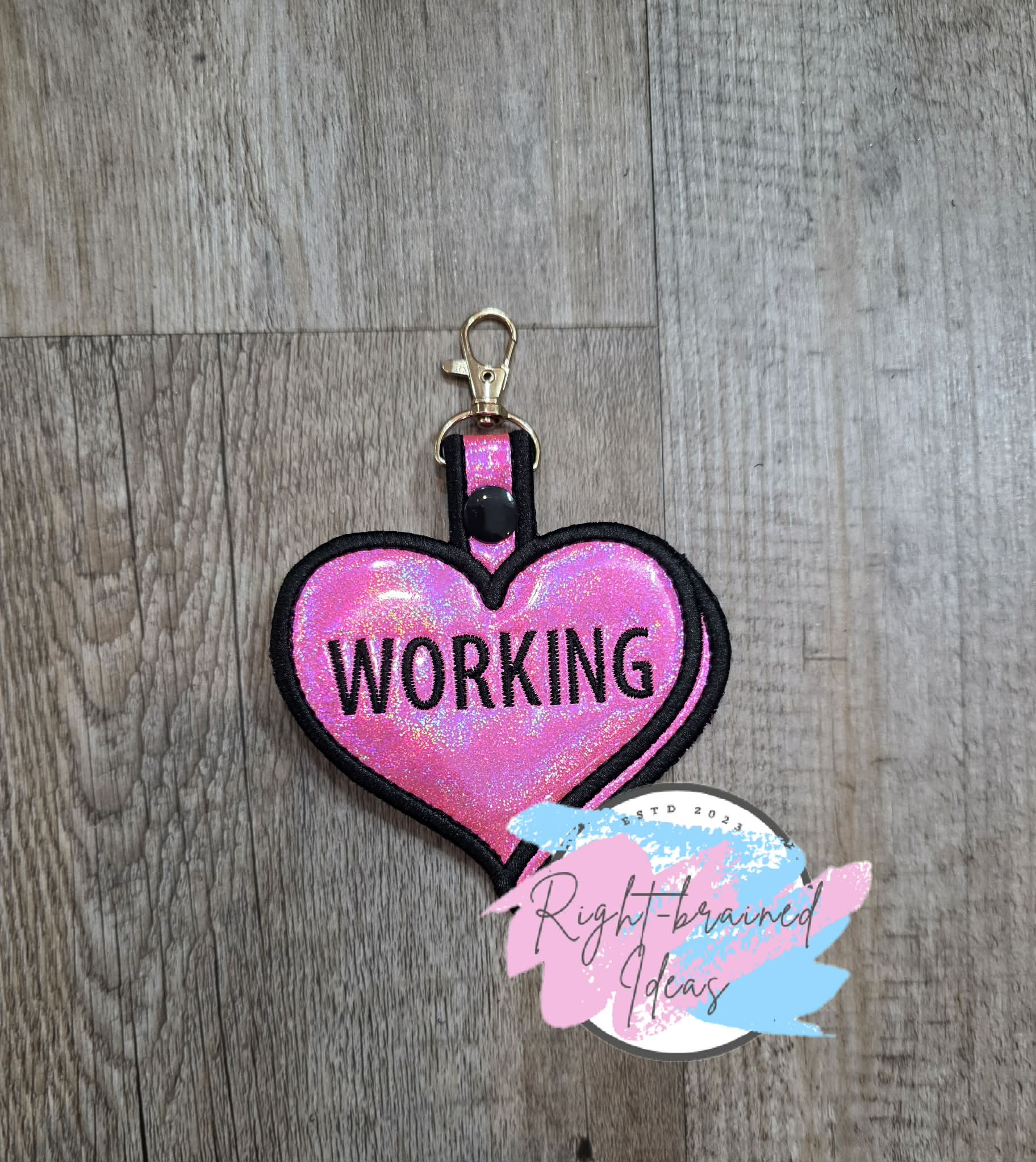 (1) 4in x 6in sparkle pink holographic heart-shaped patch tab: "Working" in black and has a black satin border.