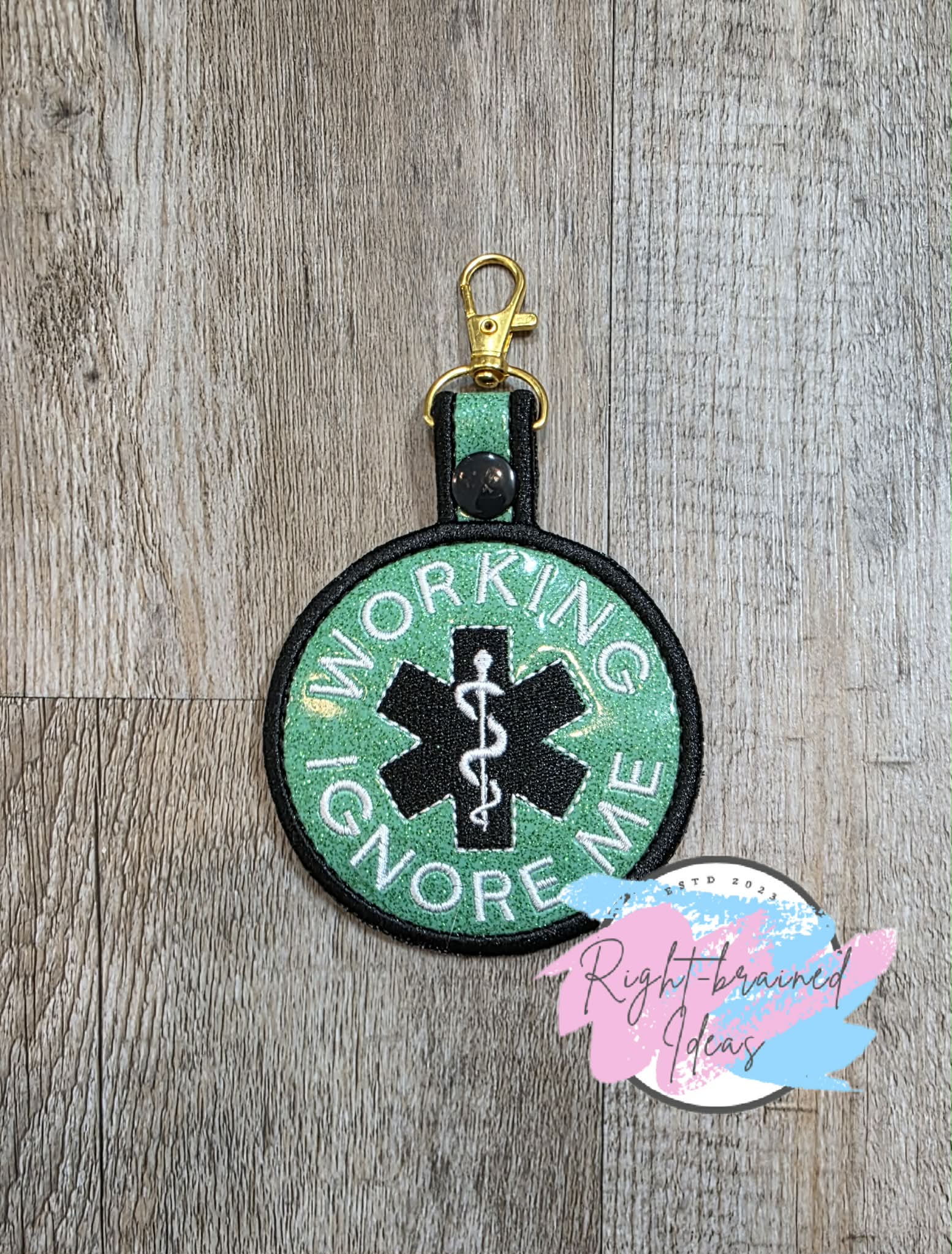 (1) 3in x 5.5in sparkle moss green vinyl circular patch tab: "Working Ignore Me" in white thread curved around a medical symbol consisting of a white staff over a black star.
